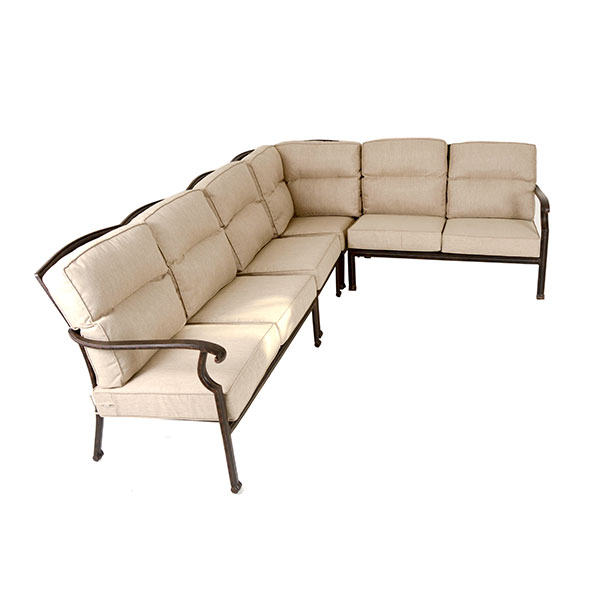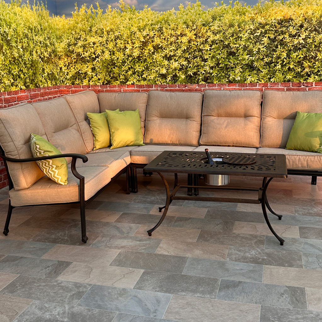 Kensington’s garden tables and garden seats are powder coated with a dark finish we call 'antique bronze'. The seat and back cushions are included and they are zipped so that the covers can be washed. The caramel coloured cushions are also boxed and piped to produce a cushion that looks better and will not be flat after a few weeks, as the box stitching and high quality thick foam maintains form.